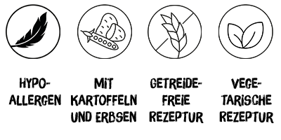 - Getreidefreie Rezeptur: Diese Rezeptur enthält keinen Zusatz von Getreide. Sie ist ideal für eine getreidefreie Ernährung gesunder wie auch empfindlicher Hunde.