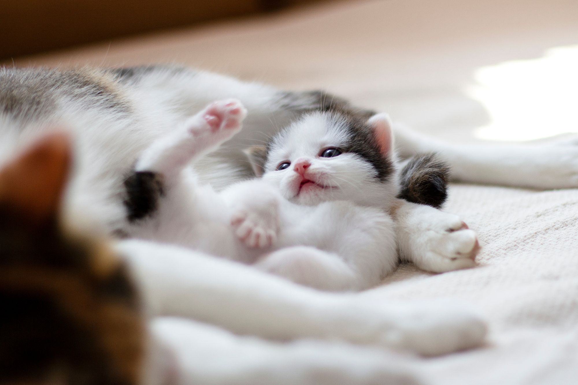 Bereits ab der 3. Woche können die ersten Milchzähnchen durchbrechen. Die Bewegungen werden zunehmend koordinierter, und aus den ersten wackeligen Versuchen entwickelt sich allmählich ein richtiges Laufen. Gleichzeitig wächst das Interesse an der Umgebung: Die Kätzchen nehmen ihre Umwelt bewusster wahr und beginnen, erste soziale Kontakte zu ihren Geschwistern zu knüpfen, etwa durch spielerisches Raufen oder gegenseitiges Putzen.