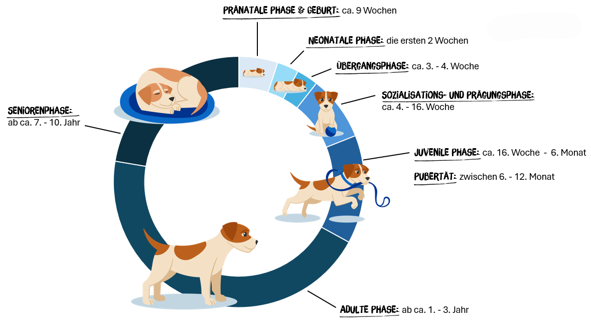 - Pränatale Phase und Geburt: Der Welpe kommt zur Welt und startet ins Hundeleben.